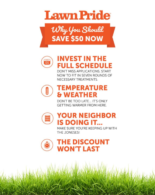 The key to a happy, healthy lawn is timeliness. It’s crucial to invest in the full 7-Application schedule, watch the springtime temperature and weather, keep up with the Joneses (because your neighbors are doing it), and not miss out on this exclusive discount. It’s not too late to invest in your lawn and watch your investment pay off. New customers: Sign up for Lawn Pride’s signature *7-Application Lawn Care Program, and we’ll take $50 off for a limited time only!